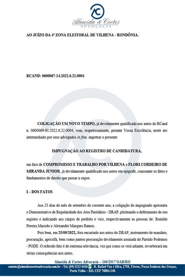 Através dos seus advogados, a coligação “Um Novo Tempo” pediu o indeferimento do registro de candidatura do delegado Flori Cordeiro Junior (Podemos), que disputa o cargo de prefeito na eleição suplementar prevista para 30 de outubro em Vilhena.