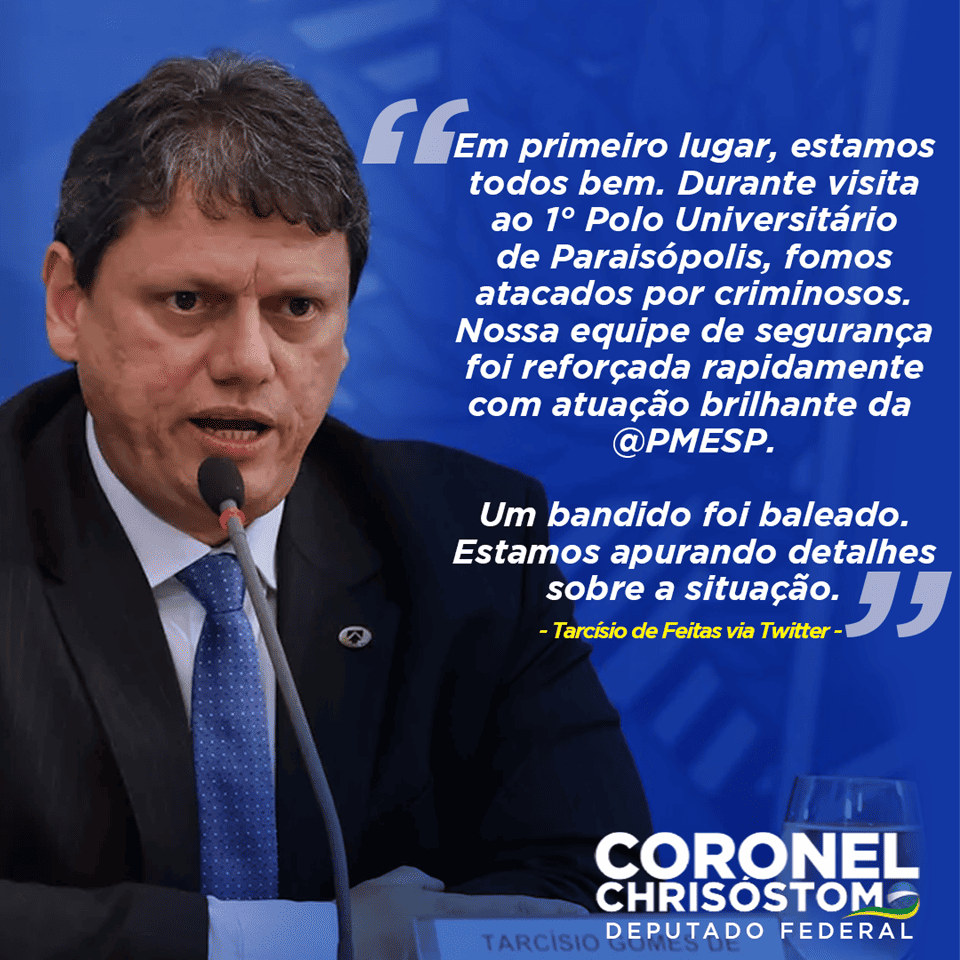 "Nosso amigo Tarcísio Gomes de Freitas sofreu um atentado a tiros durante um evento de campanha na manhã desta segunda-feira (17) em São Paulo. A Polícia Militar agiu rápido e nenhum jornalista ou integrante da comitiva se feriu", informou Coronel Chrisóstomo.