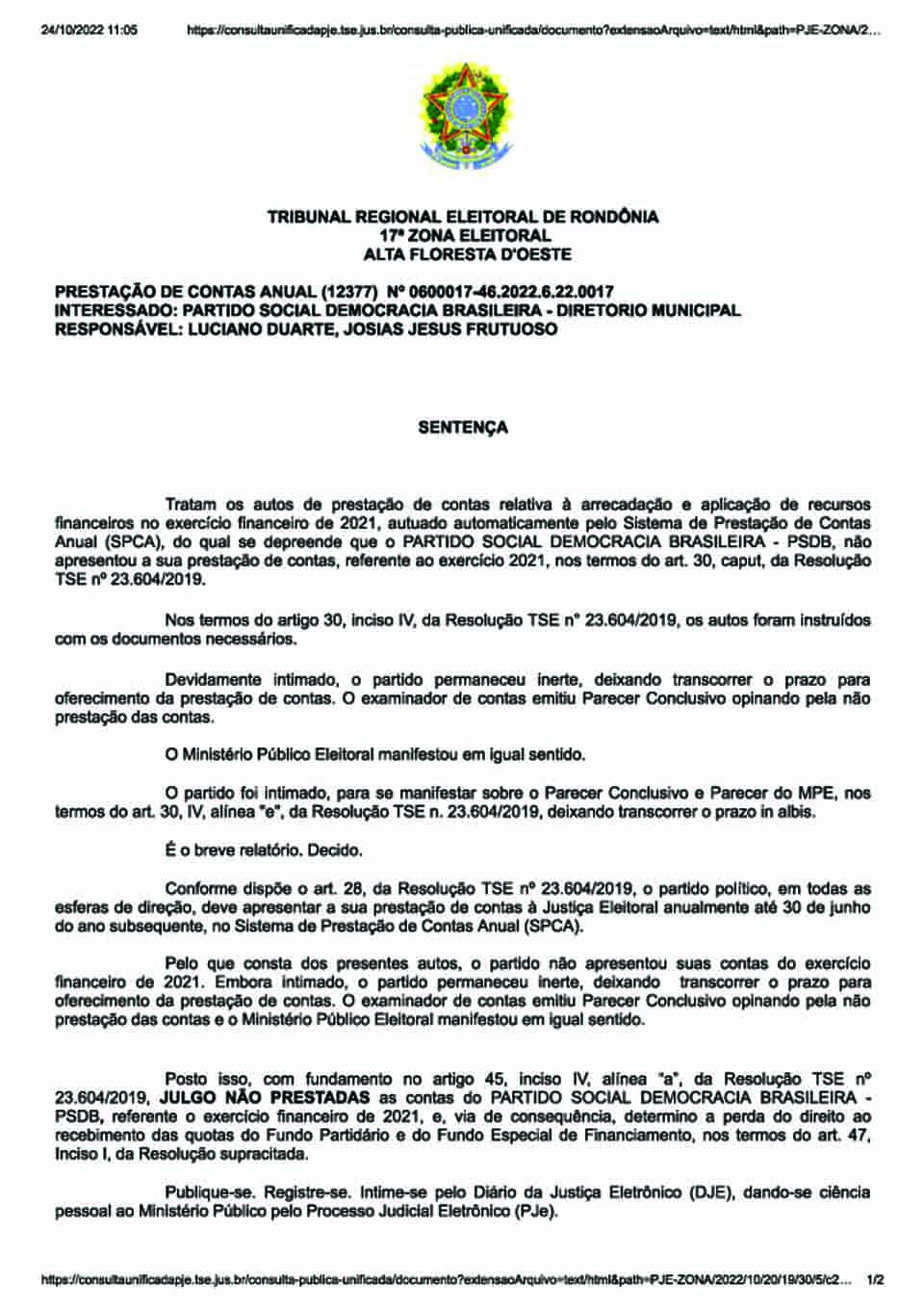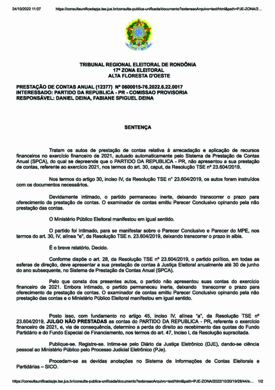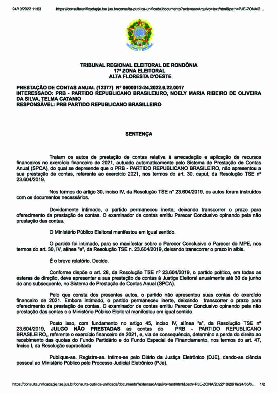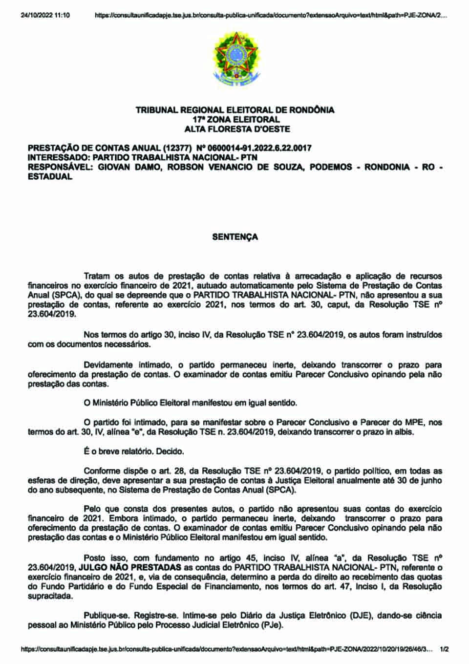 Porto Velho, RO – Em cinco sentenças distintas, a juíza eleitoral Miria do Nascimento de Souza julgou não prestadas as contas das legendas PR, PRB, PSDB, PTN e SD. Elas são relativas ao exercício financeiro de 2021.