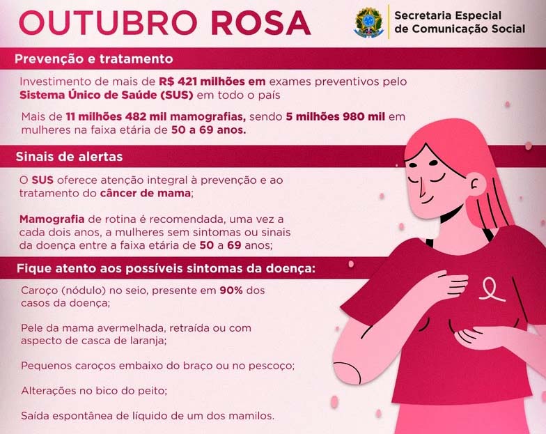 O Sistema Único de Saúde também oferece atenção integral à prevenção e ao tratamento do câncer de mama, recomendando a mamografia de rotina em mulheres sem sintomas ou sinais da doença entre a faixa etária de 50 a 69 anos, uma vez a cada dois anos. A orientação sobre mudanças habituais nas mamas em diferentes momentos do ciclo de vida e sinais suspeitos também são repassados as pacientes do SUS.