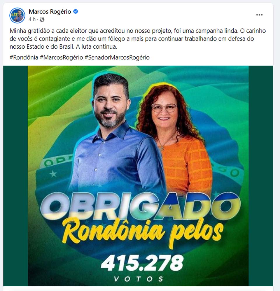 “Minha gratidão a cada eleitor que acreditou no nosso projeto, foi uma campanha linda. O carinho de vocês é contagiante e me dão um fôlego a mais para continuar trabalhando em defesa do nosso Estado e do Brasil. A luta continua”.