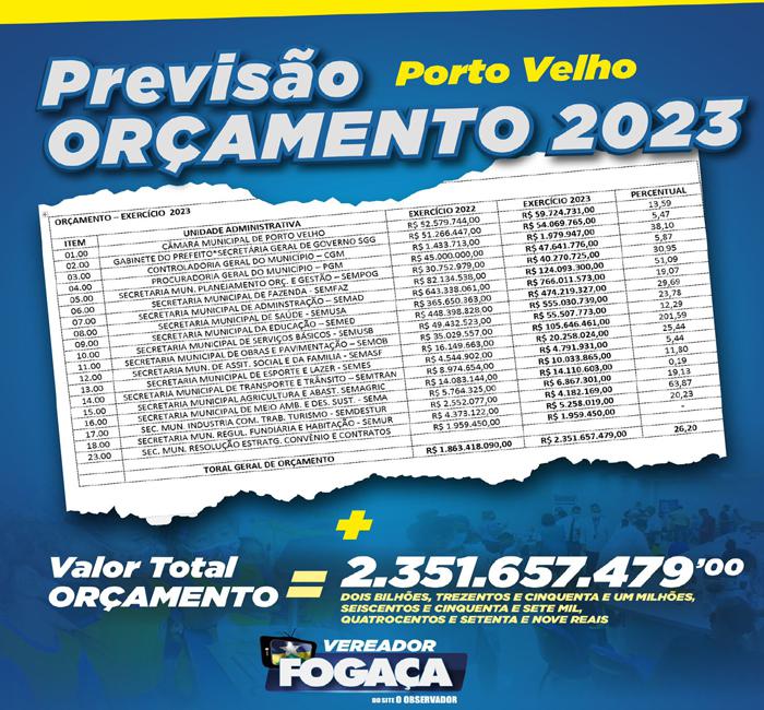 Segundo o presidente da CCJ, vereador Everaldo Fogaça (Republicano), que será o relator da proposta, antes dela ser votada em dois turnos no plenário, a proposta será 26,20% superior ao valor do Orçamento de 2022: R$ 2.351.657.479,00 (dois bilhões, trezentos e cinquenta e um milhões, seiscentos e cinquenta e sete mil e quatrocentos e setenta e nove Reais).