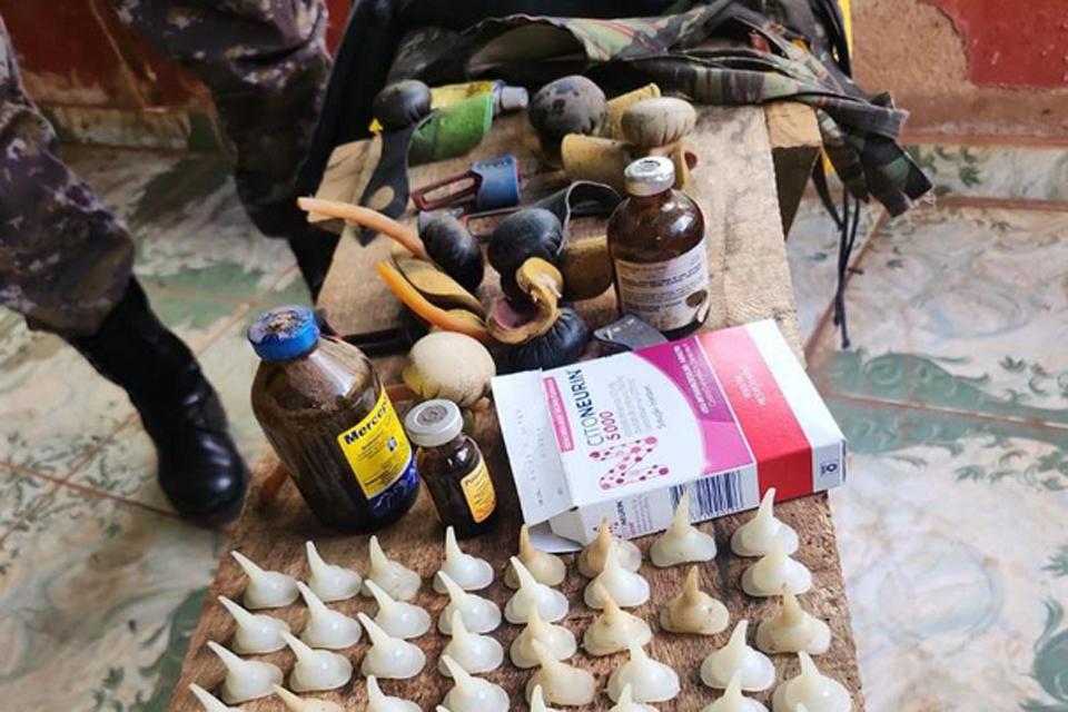 Na residência foram localizados 12 galos com claros sinais de maus- tratos por estarem mantidos em ambiente insalubre, gaiolas com dimensões diminutas e com acúmulo de fezes,e possuíam grande quantidade de penas arrancadas pelo corpo. Também foi constatado 7( sete) buchas, 1 (um) estojo, 4(quatro) biqueiras, 6 (seis) bicos de metal e 77 esporas de plásticos, dentre acessórios e medicação utilizada em competições de galo.