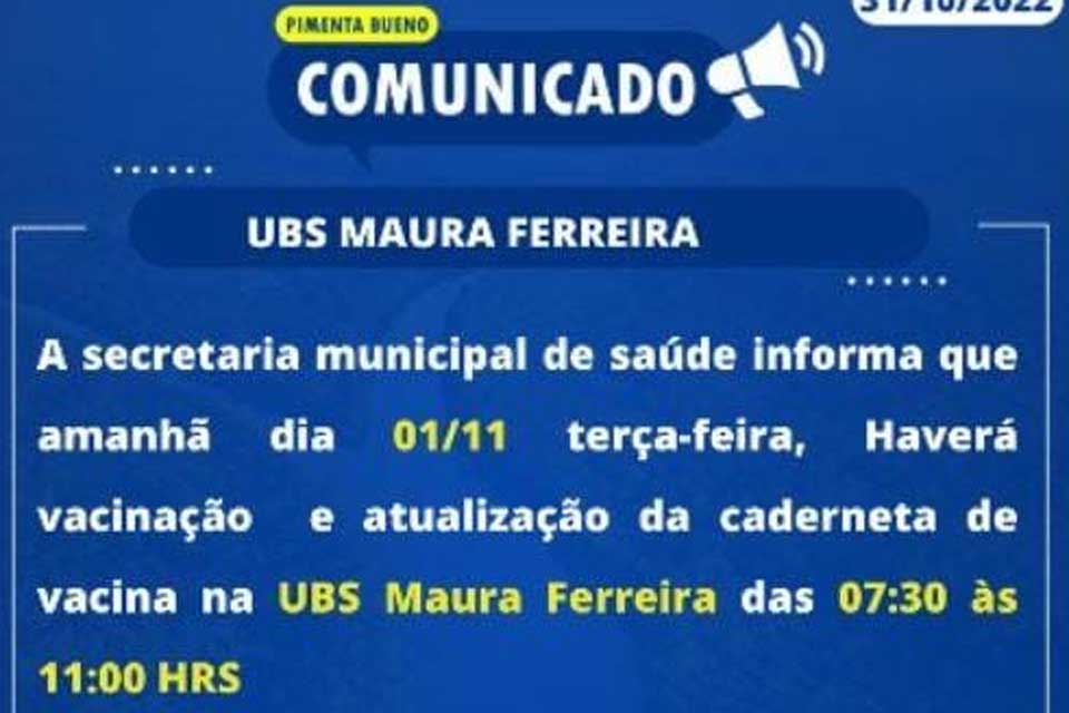 A secretaria municipal de saúde informa que amanhã dia 01/11 terça-feira, Haverá vacinação e atualização da caderneta de vacina na UBS Maura Ferreira das 07:30 às 11:00 HRS
