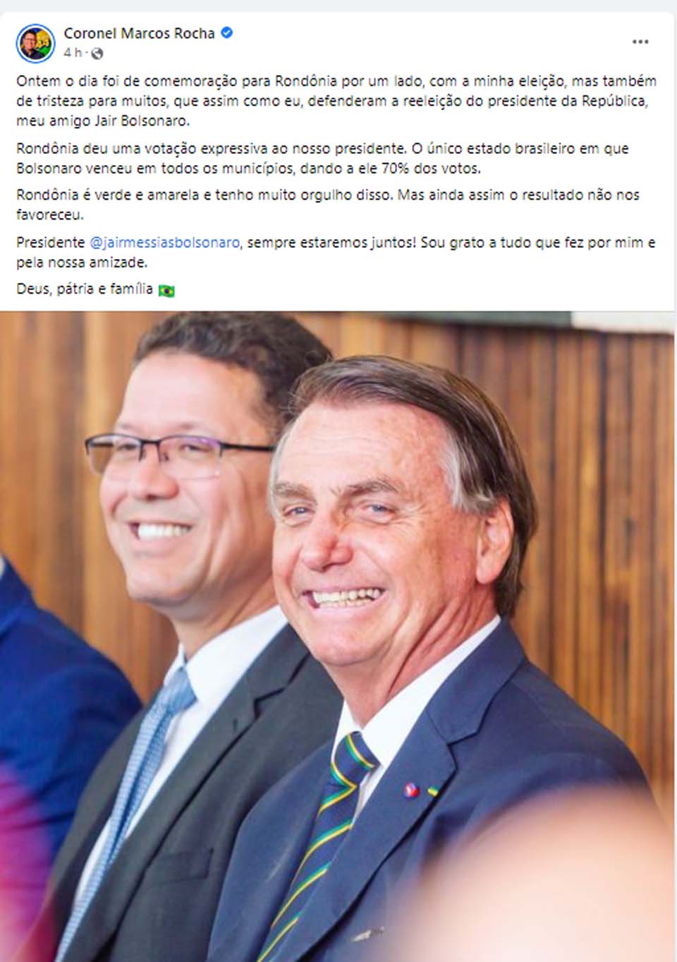 “Ontem o dia foi de comemoração para Rondônia por um lado, com a minha eleição, mas também de tristeza para muitos, que assim como eu, defenderam a reeleição do presidente da República, meu amigo Jair Bolsonaro”, destacou.