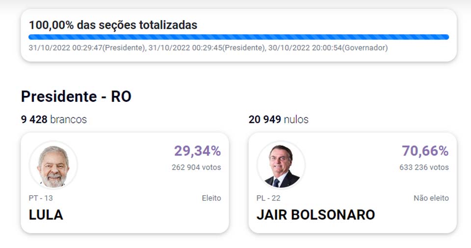 Porto Velho, RO – Em Rondônia, Jair Bolsonaro, do PL, venceu com folga o presidente eleito Lula, do PT.