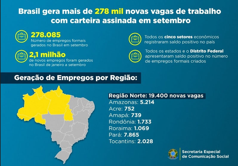 O Brasil segue em curva ascendente na geração de empregos, todas as Unidades da Federação apresentaram saldo positivo no número de empregos formais criados em setembro. No total, foram geradas 278.085 novas vagas em todo o país no mês. Com isso o estoque de trabalhadores com carteira assinada alcançou novo recorde histórico, chegando a mais de 42,8 milhões de trabalhadores formais.