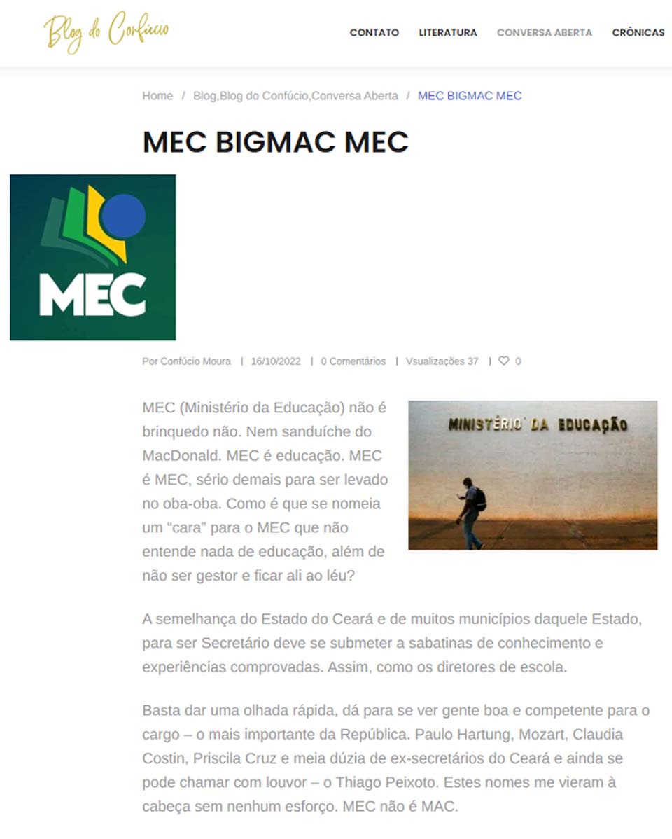 “MEC (Ministério da Educação) não é brinquedo não. Nem sanduíche do MacDonald. MEC é educação. MEC é MEC, sério demais para ser levado no oba-oba. Como é que se nomeia um “cara” para o MEC que não entende nada de educação, além de não ser gestor e ficar ali ao léu?”, questionou.