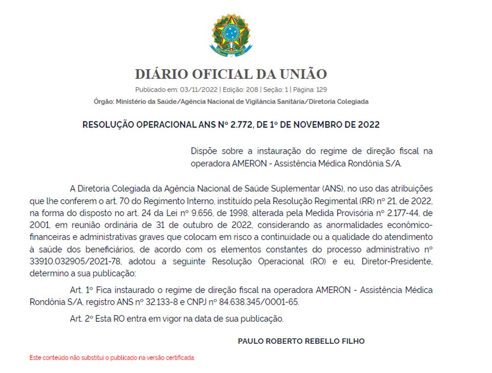 Porto Velho, RO – A Diretoria Colegiada da Agência Nacional de Saúde Suplementar (ANS) considerou “as anormalidades econômico-financeiras e administrativas graves que colocam em risco a continuidade ou a qualidade do atendimento à saúde dos beneficiários” na AMERON – Assistência Médica Rondônia S/A.