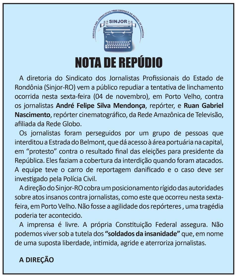 No caso dos profissionais de imprensa agredidos, verbalmente ou de forma física, o Rondônia Dinâmica presta sua solidariedade mantendo a vitrine aberta aos colegas para qualquer tipo de reivindicação e/ou expressão de indignação.