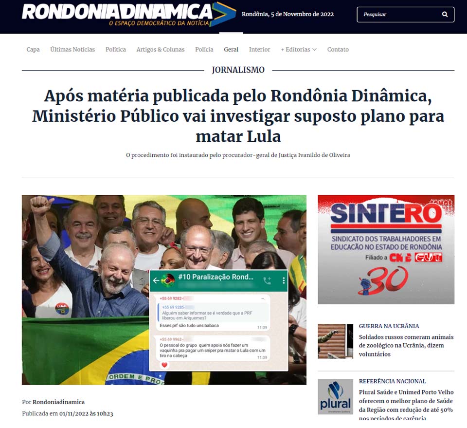 Ainda sobre violência e crime, o Rondônia Dinâmica publicou, no decorrer da semana, matéria exclusiva reportando a intenção de um grupo de WhatsApp, com membros moradores do estado, em promover uma “vaquinha” virtual para matar o presidente eleito.