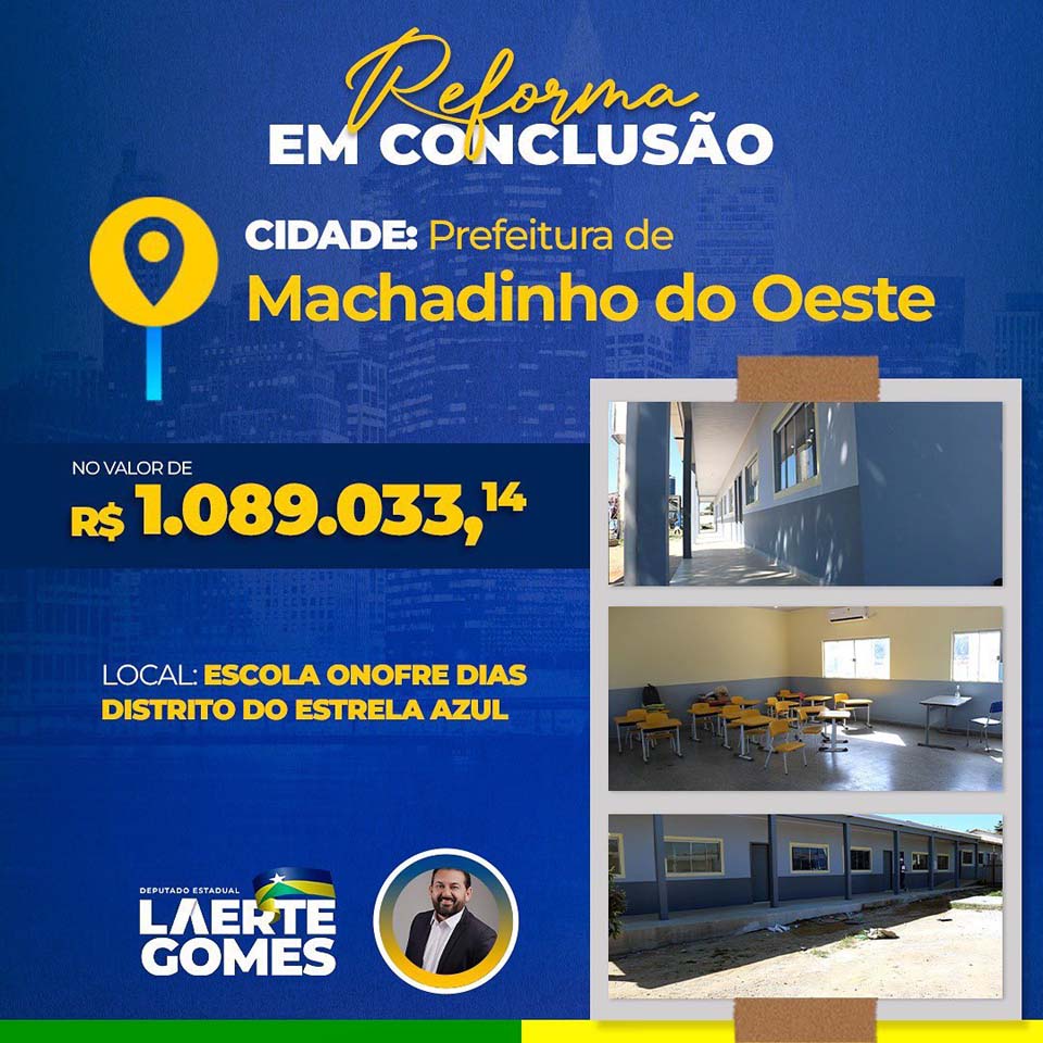 Machadinho do Oeste;RO - O Deputado Estadual Laerte Gomes, anunciou no último sábado (5), a destinação de recursos, por meio de emenda de sua autoria, no valor acima de R$ 1 milhão, para reforma de escola municipal Onofre Dias, instituição de ensino localizada no Distrito Estrela Azul, pertencente ao município de Machadinho do Oeste. As obras, segundo o deputado estão em fase de conclusão.