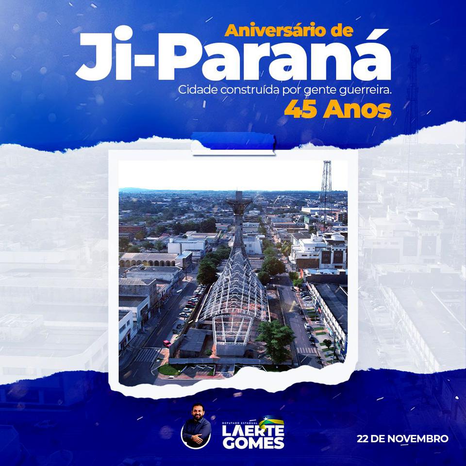 "Minha Ji-Paraná, nossa Ji-Paraná! São 45 anos de muita luta de um povo justo e trabalhador. Conhecida como a cidade do coração de Rondônia, além de parques e praças que chamam a atenção dos visitantes e de sua população, Ji-Paraná completa 45 anos de criação, ficamos felizes e orgulhosos de fazermos parte desta história", concluiu Laerte Gomes.