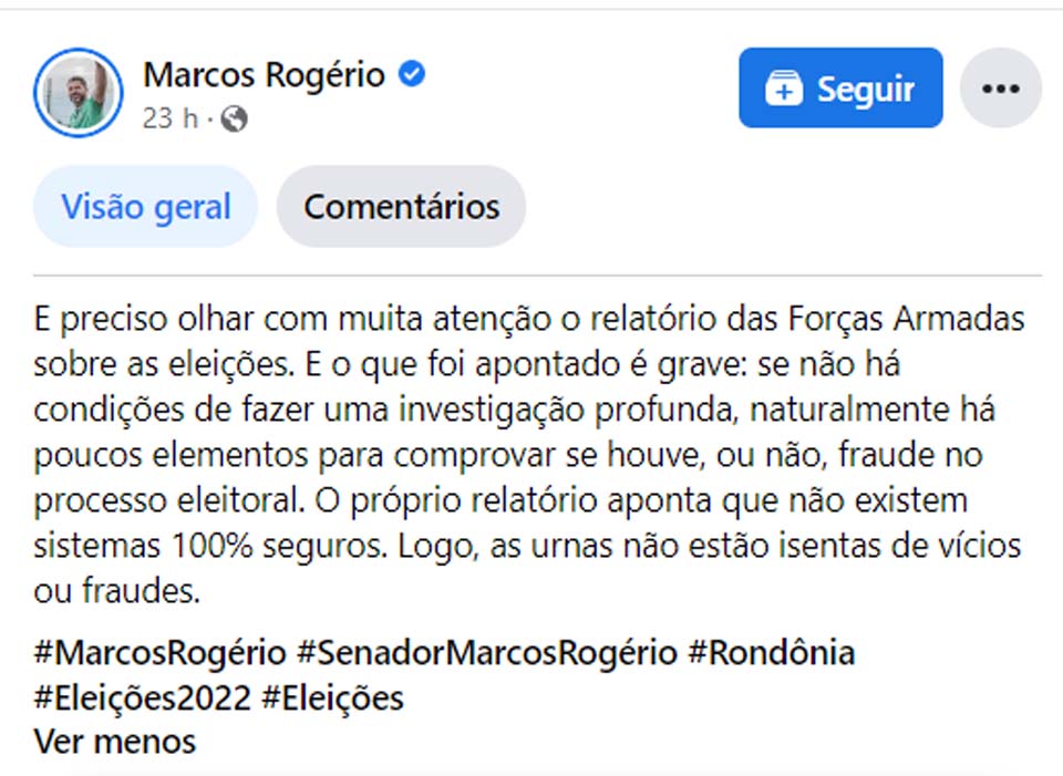 Porto Velho, RO – O senador da República Marco Rogério, do PL, que perdeu nas urnas tanto no primeiro quanto no segundo turno das eleições 2022 na corrida pelo Governo de Rondônia, aproveitou a “carona” no relatório das Forças Armadas para colocar em dúvida o processo eleitoral brasileiro.