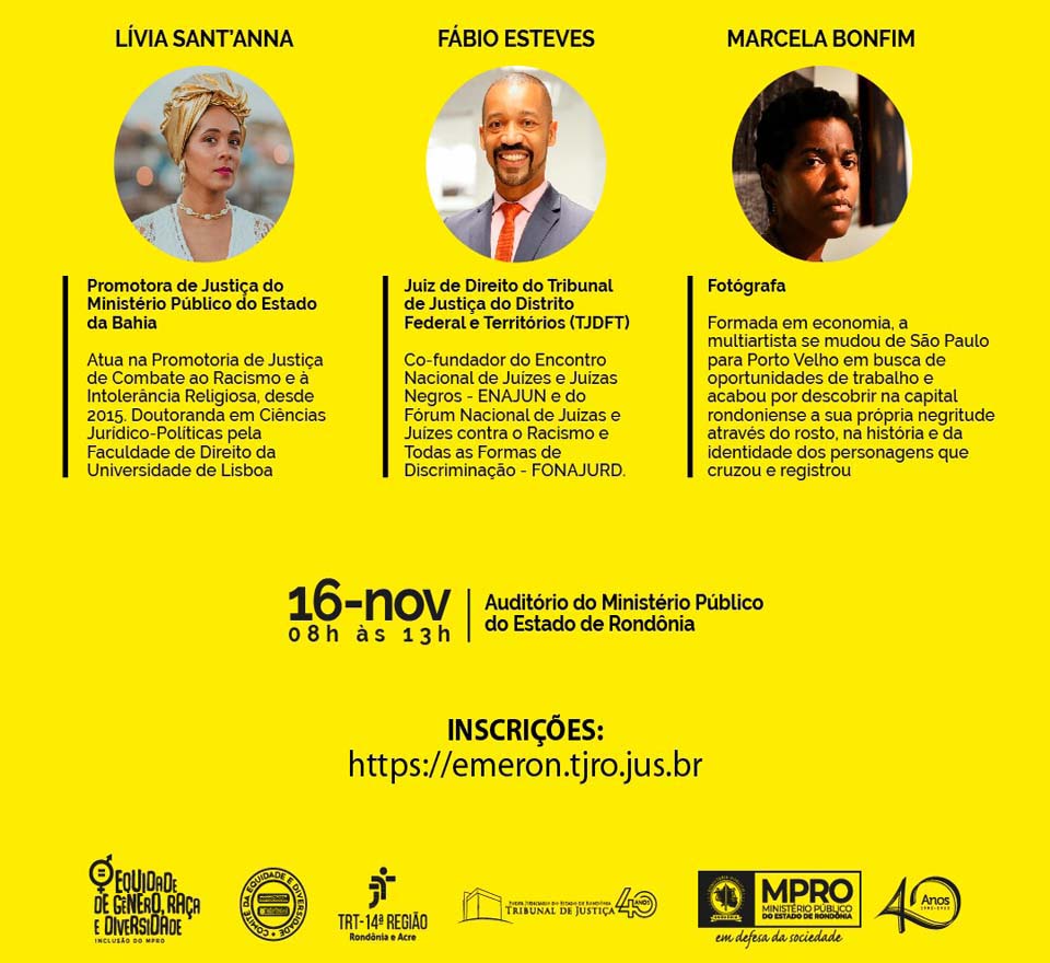 O Comitê Gestor da Política Interinstitucional de Equidade de Gênero, Raça e Diversidade, composto pelo Ministério Público de Rondônia, Tribunal de Justiça de Rondônia e Tribunal Regional do Trabalho da 14ª Região, promoverá no dia 16 de novembro, das 8h às 13h, o seminário “Racismo, Antirracismo e Políticas Institucionais”, alusivo ao Mês da Consciência Negra em Rondônia.