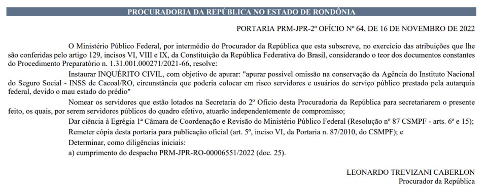 Desta feita, a fim de apurar possível omissão na conservação da Agência do Instituto Nacional do Seguro Social (INSS) em Cacoal.