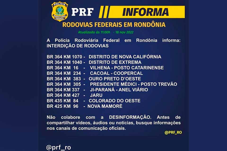 A PRF (Polícia Rodoviária Federal) confirmou bloqueios nos municípios de Cacoal, Vilhena, Presidente Médici, Ji-Paraná, Jaru, Ouro Preto do Oeste, Colorado do Oeste, Nova Mamoré e nos distritos de Nova Califórnia e Extrema.