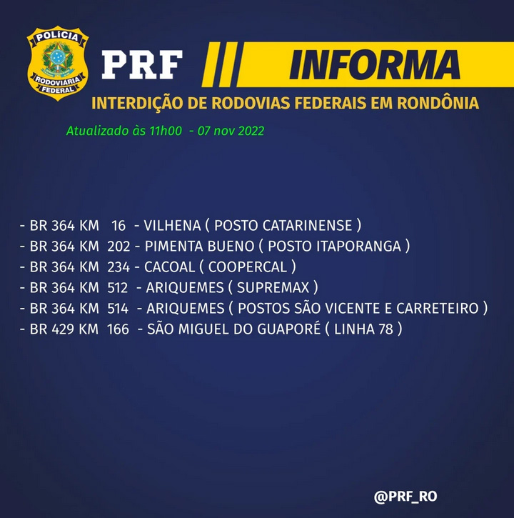 Na manhã desta segunda-feira (07) a Polícia Rodoviária Federal (PRF) confirmou que há seis interdições em rodovias federais em Rondônia, na qual, está sendo realizada por manifestantes que protestam contra o resultado das eleições presidenciais ocorridas no último dia 30 de outubro.