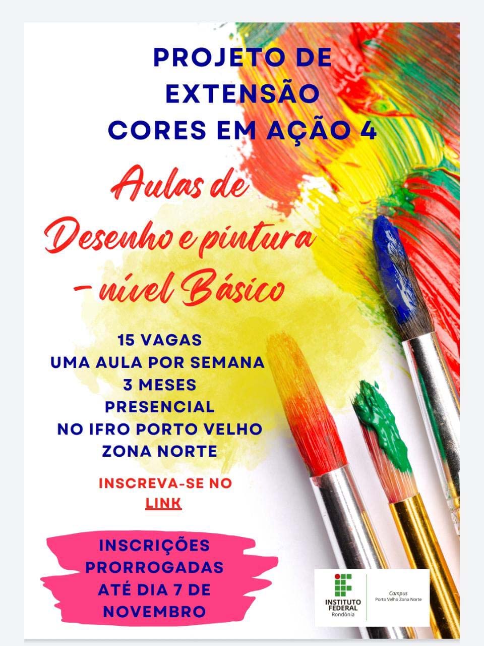 Porto Velho, RO – A Direção-Geral do Campus Porto Velho, zona Norte, do Instituto Federal de Educação, Ciência e Tecnologia de Rondônia (IFRO), no uso de suas atribuições legais, tornou público por meio do Departamento de Extensão, o edital simplificado para o Projeto de Extensão Cores em Ação 4.