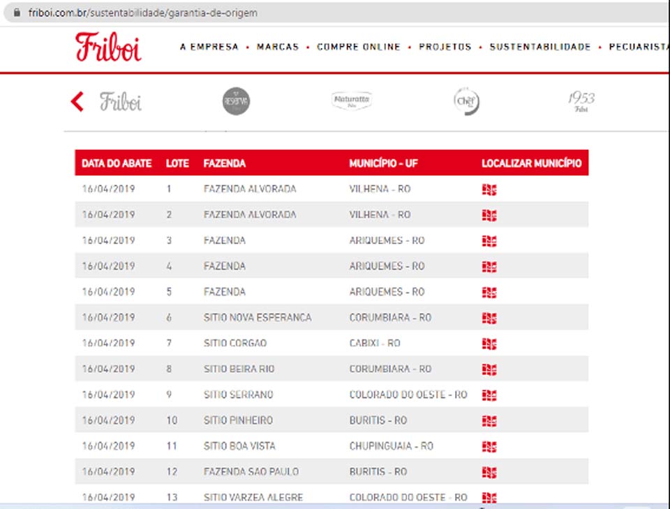JBS publica informações sobre as fazendas que originam os produtos que vende nos supermercados brasileiros, mas irregularidade em Rondônia não aparece no sistema de transparência (Reprodução)