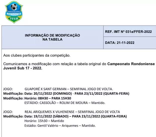 Após os bloqueios na BR364 interromperem mais uma vez a competição juvenil, o departamento de competições remarcou os jogos da volta das semifinais. As partidas entre Real Ariquemes x Vilhenense e Guaporé x Sant German devem ser realizadas na tarde da próxima quarta feira (23).