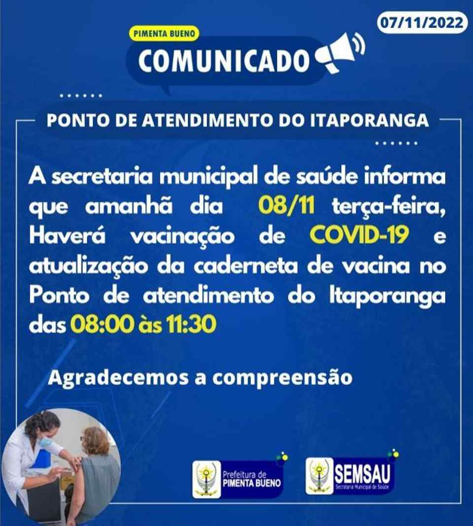 A secretaria municipal de saúde informa que amanhã dia 08/11 terça-feira, Haverá vacinação de COVID e atualização da caderneta de vacina no Ponto de atendimento do Itaporanga das 08:00 às 11:30 Hrs.