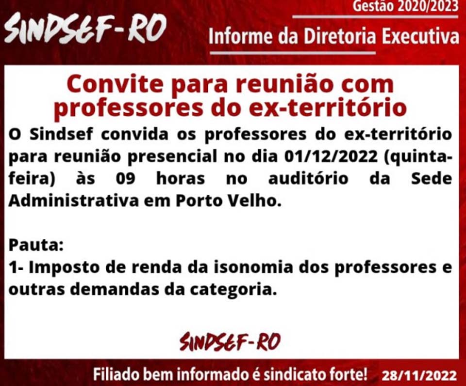 SINDSEF-RO convida professores do ex-território para reunião presencial para discutir demandas da categoria