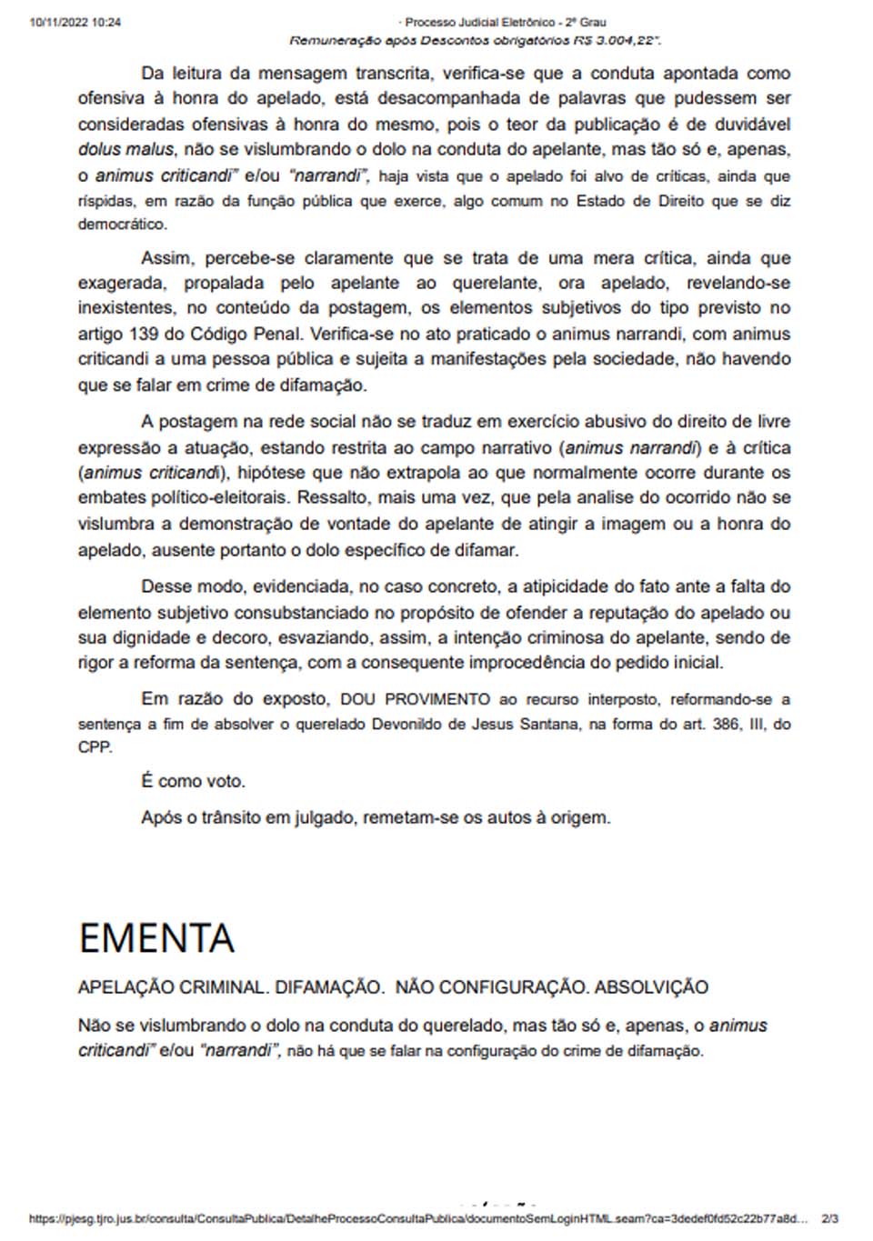 “Da leitura da mensagem transcrita, verifica-se que a conduta apontada como ofensiva à honra do apelado, está desacompanhada de palavras que pudessem ser consideradas ofensivas à honra do mesmo, pois o teor da publicação é de duvidável dolus malus, não se vislumbrando o dolo na conduta do apelante, mas tão só e, apenas, o animus criticandi” e/ou “narrandi”, haja vista que o apelado foi alvo de críticas, ainda que ríspidas, em razão da função pública que exerce, algo comum no Estado de Direito que se diz democrático”.