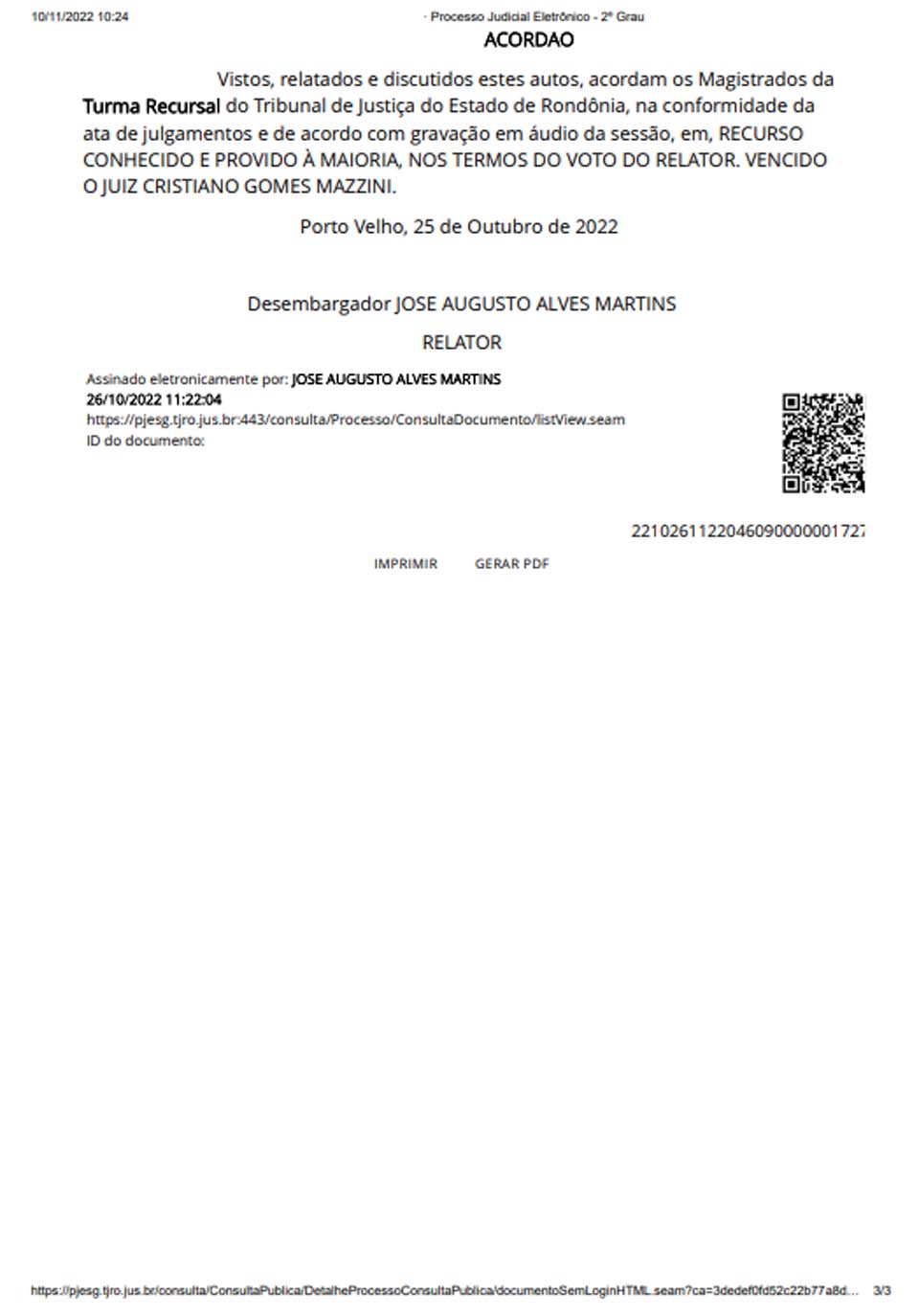 O juiz Cristiano Gomes Mazzini, que se manifestou de maneira contrária, foi vencido pela maioria, prevalecendo a absolvição.
