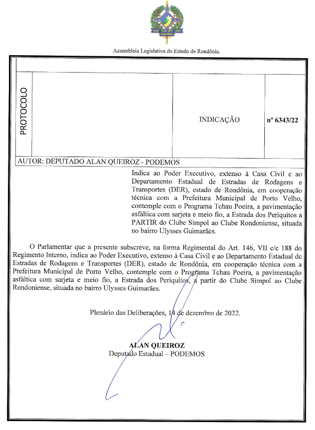 Dessa forma, foi indicado ao Poder Executivo, extenso à Casa Civil e ao Departamento Estadual de Estradas de Rodagens e Transportes (DER), estado de Rondônia, em cooperação técnica com a Prefeitura Municipal de Porto Velho, contemple com o Programa Tchau Poeira, a pavimentação asfáltica com sarjeta e meio fio, a Estrada dos Periquitos, a partir do Clube Simpol ao Clube Rondoniense, situada no bairro Ulysses Guimarães.