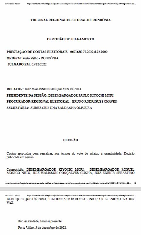 “Portanto, cumpridas todas as exigências e formalidades legais, a partir da apresentação integral da documentação prevista na norma de regência, é imperativa a aprovação das contas de campanha relativas às eleições de 2022 apresentadas pela parte requerente.”, afirma o documento.