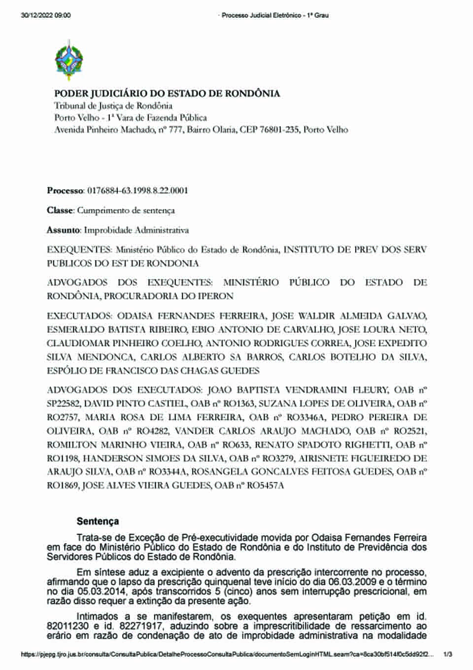 Porto Velho, RO – A ex-vice-governadora Odaísa Fernandes Ferreira, que também ocupou a Presidência do Instituto de Previdência dos Servidores Públicos do Estado de Rondônia (IPERON), tentou “barrar” judicialmente um dos efeitos de condenação por improbidade administrativa na modalidade dolosa.