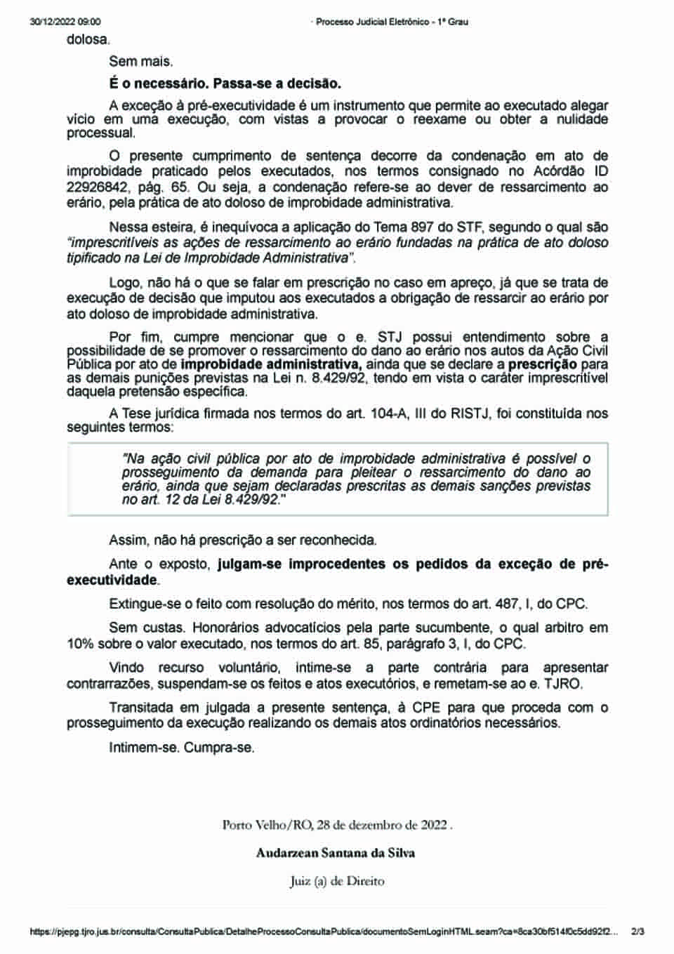 “O presente cumprimento de sentença decorre da condenação em ato de improbidade praticado pelos executados, nos termos consignado no Acórdão ID 22926842, pág. 65. Ou seja, a condenação refere-se ao dever de ressarcimento ao erário, pela prática de ato doloso de improbidade administrativa”.