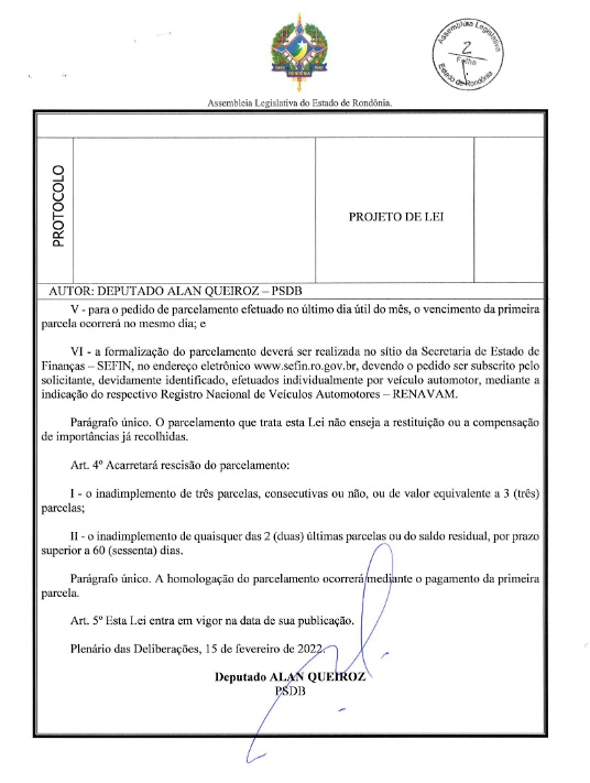 O Governador do Estado de Rondônia, no uso de suas atribuições, sancionou nesta quarta-feira (21) a lei que permite o parcelamento do IPVA em até 5 vezes. A Lei de N° 5.515 é de autoria do Deputado Estadual Alan Queiroz (Pode).