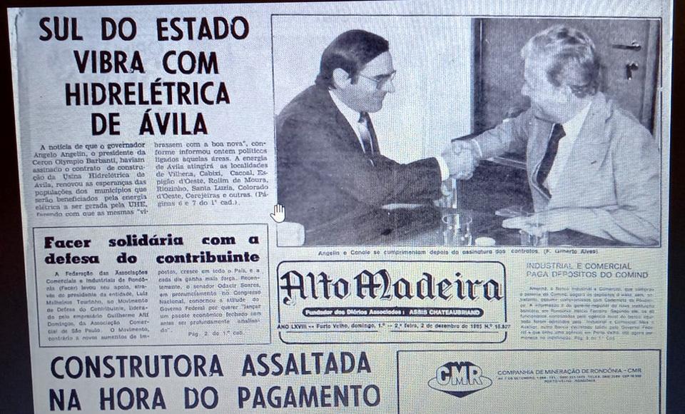 Em 1985 o governador Angelo Angelin deu um grande passo em busca de melhor qualidade de vida e de aumento da economia da região sul rondoniense, ao assinar o contrato para a construção da hidrelétrica do Rio Ávila, em área do município de Vilhena. Angelin, um professor paulista que se instalou em Vilhena no final da década de 1970, foi eleito deputado estadual e um dos que elaboraram em 1983 a primeira Constituição de Rondônia. Em 1985, na composição política denominada “Frente Liberal”, foi escolhido para substituir o governador Jorge Teixeira, entre 10 de maio de 1985 e 15 de março de 1987 quando passou o governo a Jerônimo Santana, o 1º eleito para o cargo no Estado. Durante o governo de Angelo Angelin (n. 1935/m. 2017) Rondônia ultrapassou o primeiro milhão de habitantes, ainda no período de migração alta vinda do centro-sul brasileiro. (F. Angelin, paletó preto)