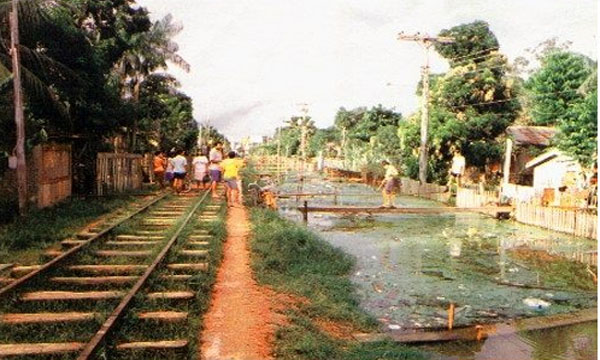 Em 1977, numa canoa, fazíamos matéria sobre a cheia do Rio Madeira, alagando todo baixo Triângulo até a AV. Rogério Weber, quando surgiu de uma touceira outra canoa com dois passageiros, o piloto e uma senhora bem conhecida da sociedade, dona Gilsa Guedes, esposa do governador Humberto Guedes, que visitava as famílias com o projeto de leva-las para uma área que ela denominou – “Meu Pedacinho de Chão”. Sob acusações do MDB, do deputado federal Jerônimo Santana e de um braço da Arena ao governo de seu marido, ela foi em frente com o projeto, mas as críticas levaram muitas famílias a não aceitar, ficando nas casas alagadas, como as dessa foto de 1980, o que se repete em toda alagação. Na nossa canoa eu, o jornalista, professor e historiador Amizael Silva e o Edinho (Edson Luiz). Foto Carlos Alberto da Costa/Rondônia Minha Querida Rondônia.