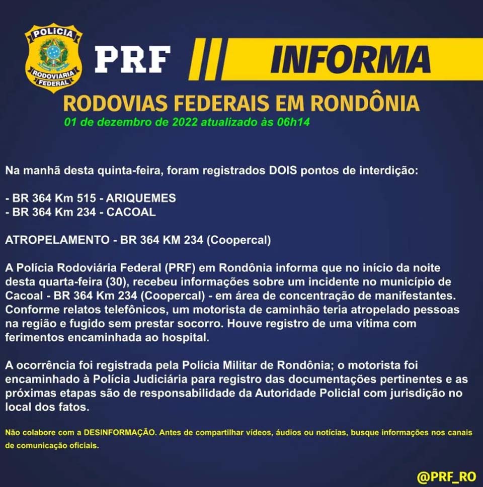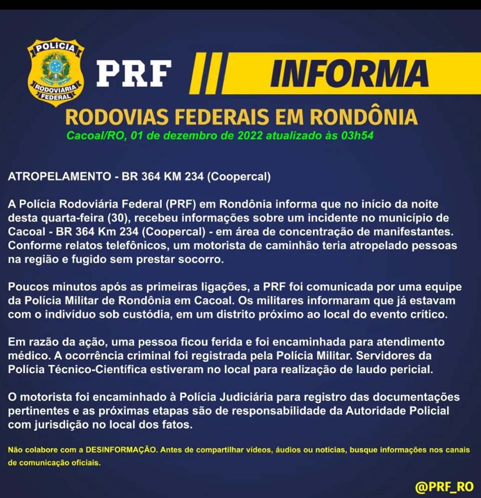 A PRF também emitiu nota a respeito do atropelamento em Cacoal (Coopercal).