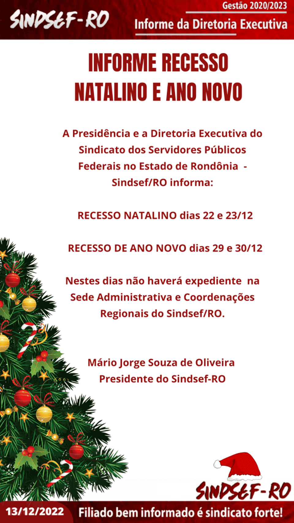Sindicato dos Servidores Públicos Federais no Estado de Rondônia-SINDSEF-RO informa sobre recesso Natalino e de Ano Novo