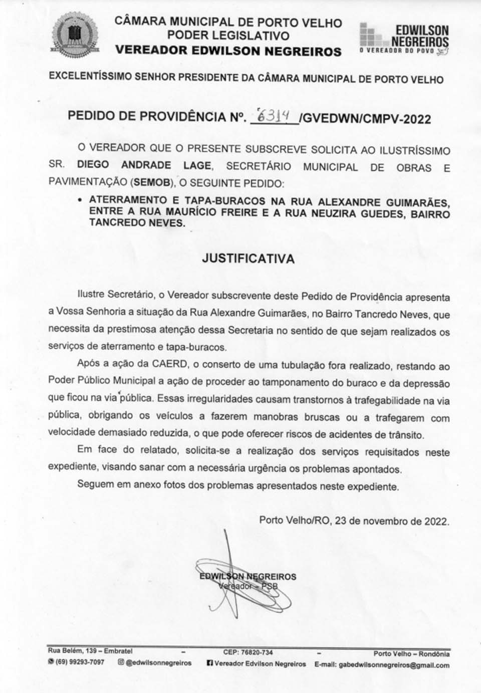 Com isso, a Prefeitura da Capital realizou serviços de aterramento e operação tapa-buracos na Rua Alexandre Guimarães entre as vias Maurício Freire e Neuzira Guedes. A diligência, formalizada pela gestão Hildon Chaves (PSDB) após o encaminhamento do Pedido de Providências por parte de Negreiros, contribuiu, consequentemente, com as reparações no local apontado.