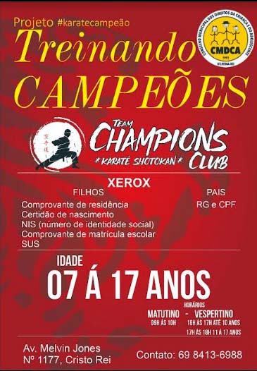 Com objetivo de incentivar a prática esportiva em Vilhena a Academia Champions Clube abre entre os dias 09 a 23 de janeiro inscrições para participação no projeto social “Treinando Campeões” que oferece aulas de karatê gratuitamente.