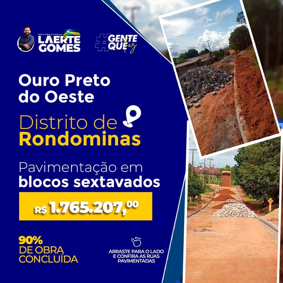 Ouro Preto do Oeste;RO - O Deputado Estadual Laerte Gomes destinou na última semana, recurso na ordem de R$ 1.765.207 mil, por meio de emenda de sua autoria, para pavimentação de vias em Rondominas, Distrito pertencente ao município de Ouro Preto do Oeste.