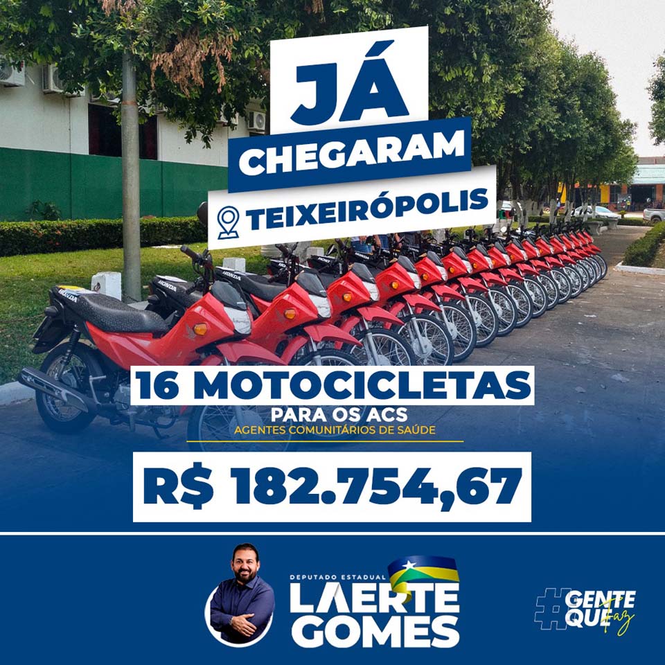Teixeirópolis;RO - O Deputado Estadual Laerte Gomes, anunciou nesta quinta-feira (5), a aquisição de 16 motocicletas, veículos que já foram entregues para os agentes comunitários de Saúde do município de Teixeirópolis.