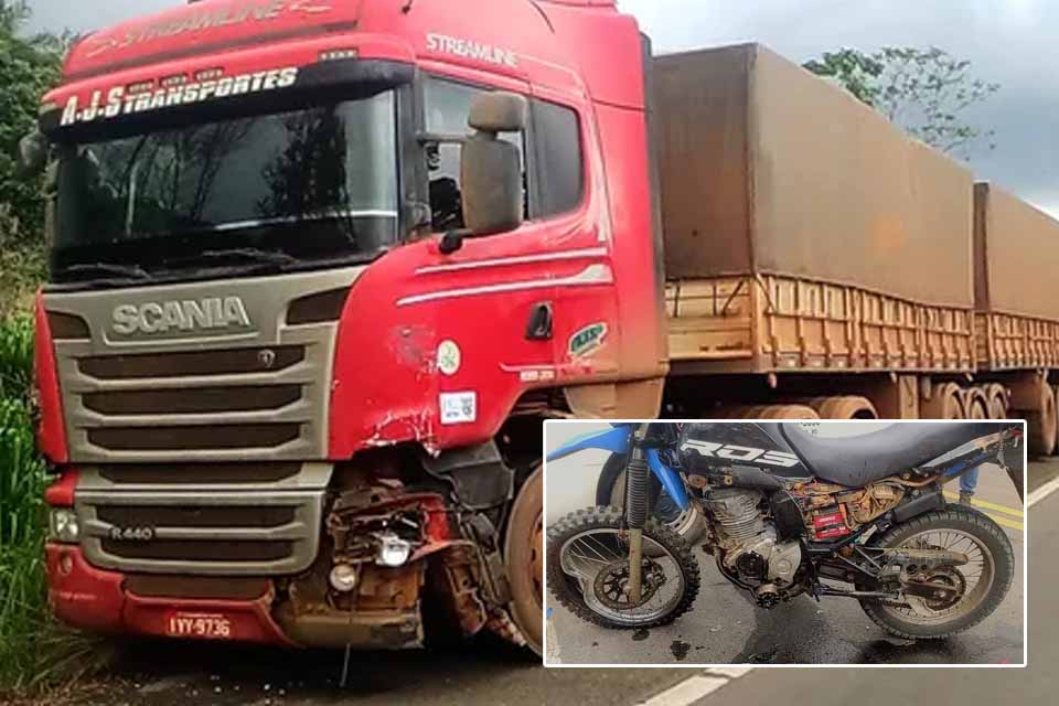Um motociclista morreu na tarde de sexta-feira (6), após bater contra uma carreta na BR-364, em Ariquemes (RO). A vítima foi identificada como Valdir F. M., de 41 anos.