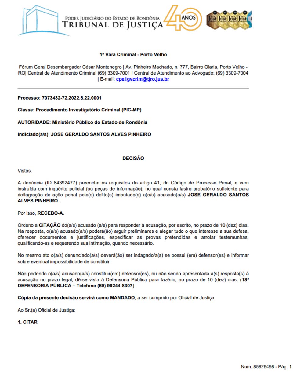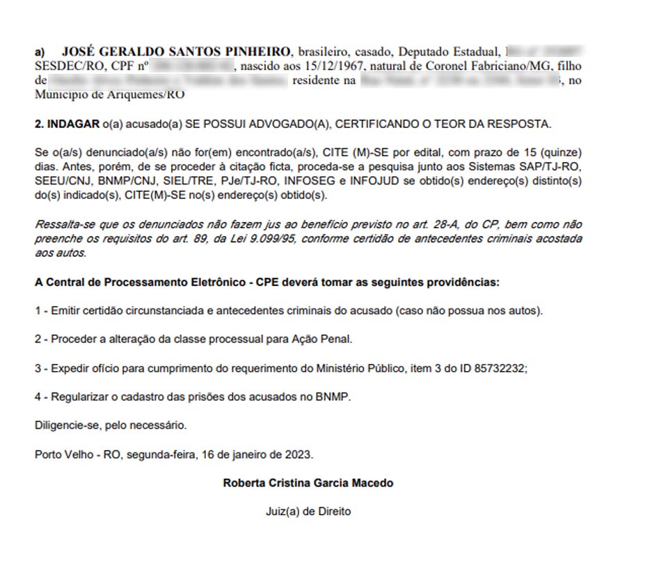 Agora, no dia 16 de janeiro, a juíza Roberta Cristina Garcia Macedo, atuando pela 1ª Vara Criminal - Porto Velho, recebeu a denúncia “no qual consta lastro probatório suficiente para deflagração de ação penal”.