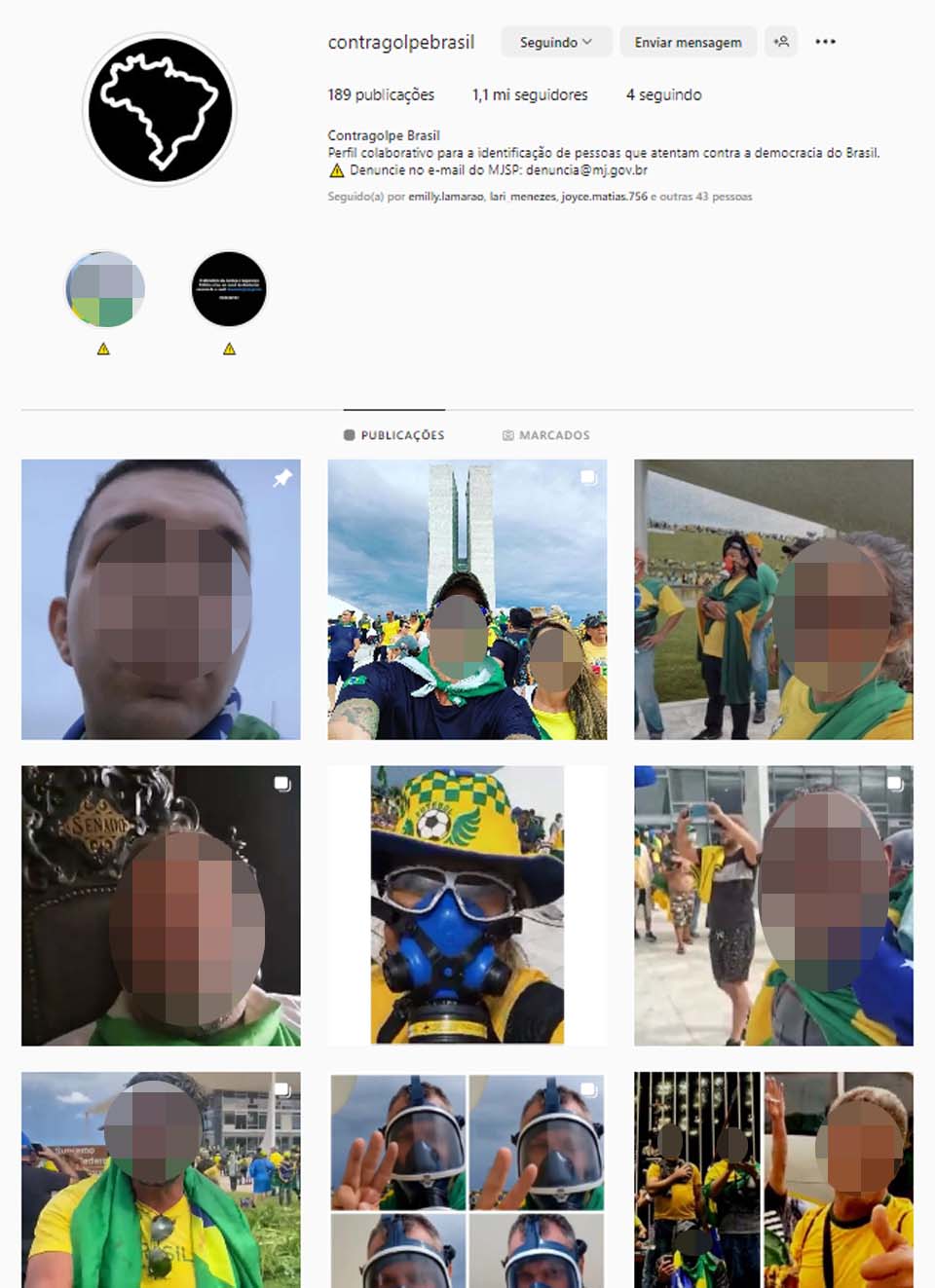 Boa parte do trabalho para a responsabilização dos criminosos é desencadeada pela própria sociedade civil organizada por meio das redes sociais, especialmente no perfil @contragolpebrasil, conta com mais de 1,1 milhão de seguidores deste a ofensiva ilícita no Planalto, Supremo (STF) e Congresso Nacional.