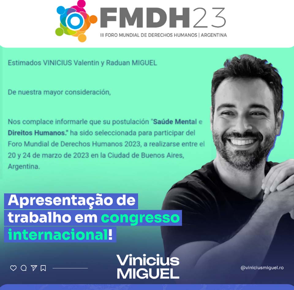 Porto Velho, RO – O advogado, sociólogo e professor universitário porto-velhense Vinicius Miguel apresentará um painel sobre Saúde Mental e Direitos Humanos no III Fórum Mundial de Direitos Humanos, que acontecerá entre 20 e 24 de março de 2023, em Buenos Aires, Argentina.