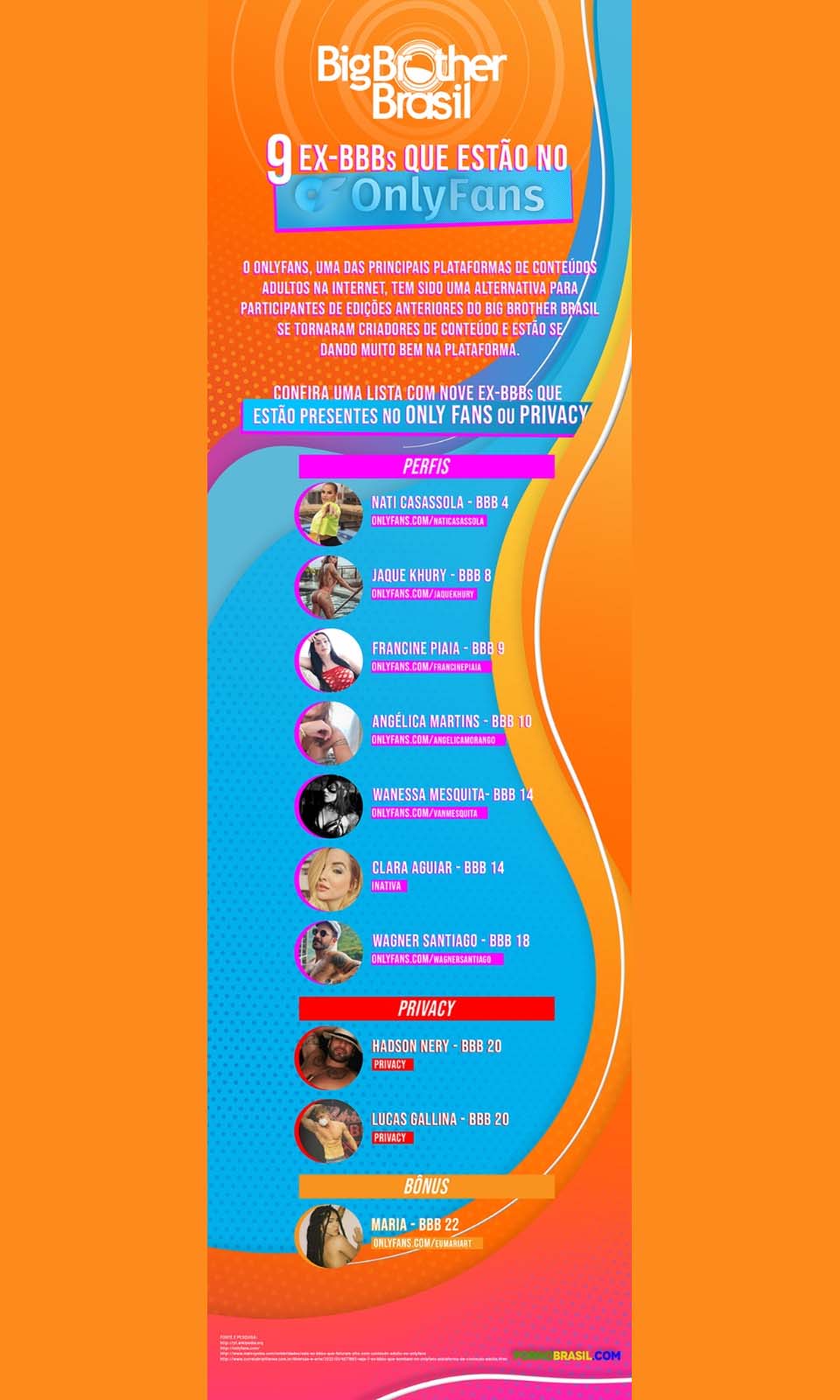 Mas a lista não para por aí, outros dez ex-BBBs estão presentes nas plataformas de conteúdo adulto e se você quiser saber quem são eles, basta conferir o infográfico abaixo.