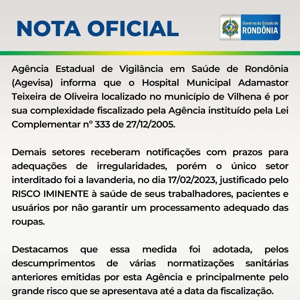Não, não é verdade também o que propaga o Senhor Prefeito, que o Hospital Regional tenha sido interditado pela Agência Estadual de Vigilância em Saúde de Rondônia (Agevisa), que inclusive acaba de publicar nota a respeito. Somente a lavanderia fora interditada, e que aliás, caso o prefeito tivesse tido a sabedoria de dialogar com nossas instituições, estaríamos dispostos a ajudar a resolver o problema, assim como o fizemos recentemente, já no atual mandato, ao ceder um imóvel da Sicoob Credisul, sem custos de aluguel, para abrigar um órgão da Secretaria de Saúde, a pedido do próprio prefeito Flori Cordeiro.
