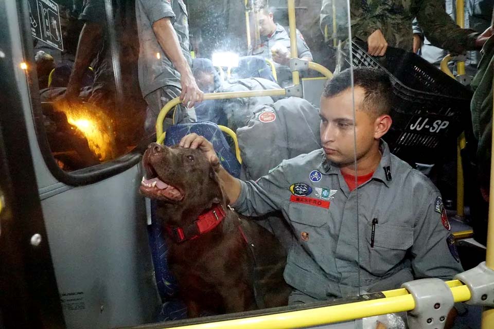 22 bombeiros, dois médicos militares, dois integrantes da Defesa Civil, e três pastores belgas malinois e uma labradora, embarcaram na madrugada desta quinta (9).