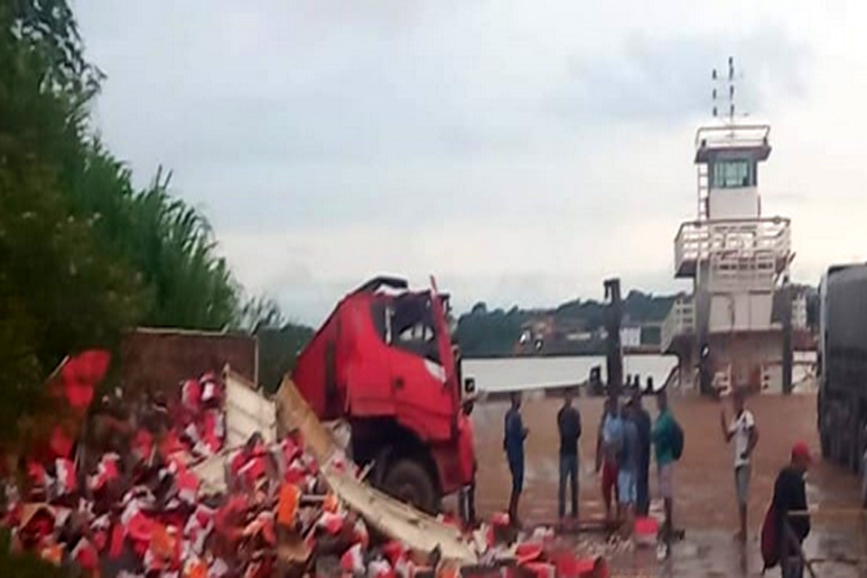 Uma carreta carregada de caixas com alho se envolveu em um grave acidente em uma balsa no rio Madeira, em Porto Velho (RO).